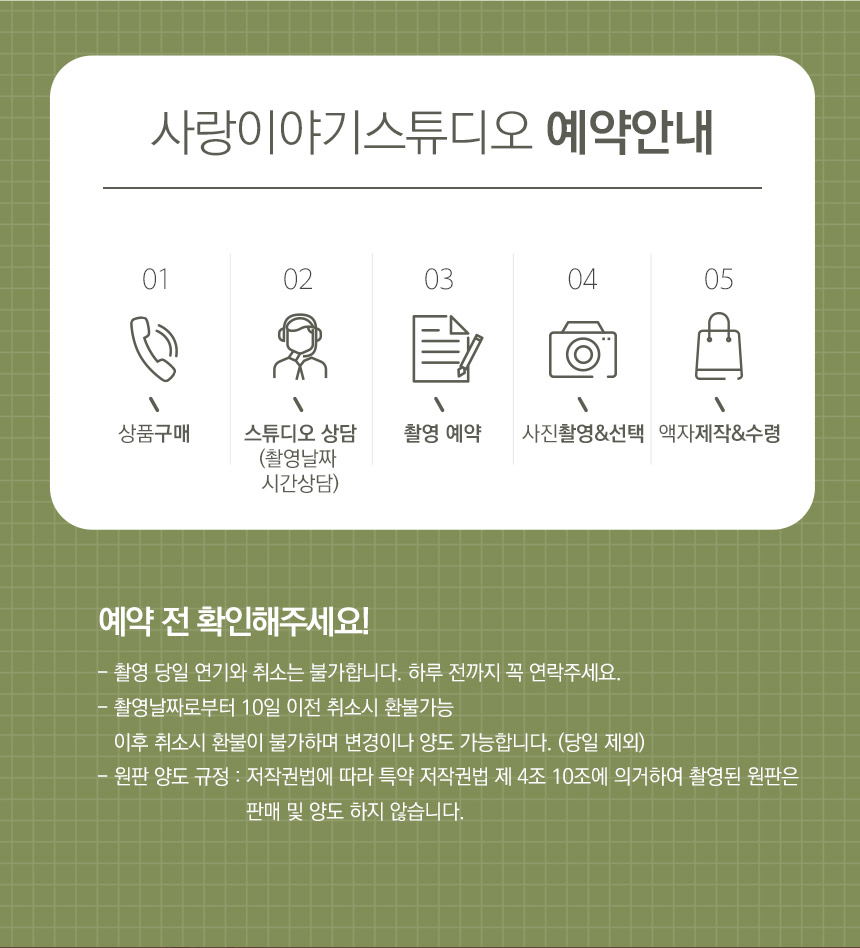 1. 촬영예약 후 10일전 취소 시 전액 환불 또는 촬영일 변경